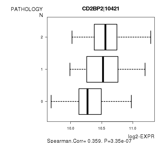 Figure S4. Get High-res Image As an example, this figure shows the association of CD2BP2|10421 to 'PATHOLOGY.N'. P value = 3.35e-07 with Spearman correlation analysis.