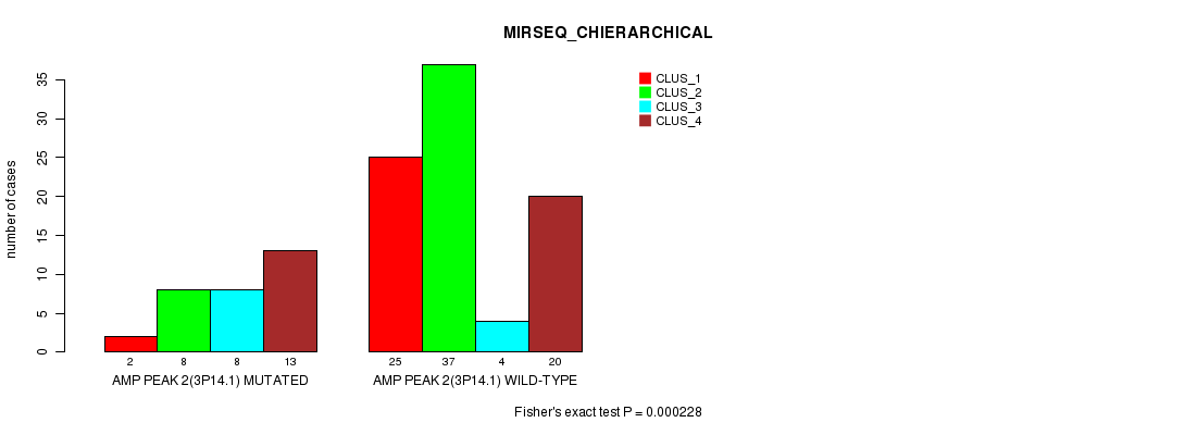 Amp Peak 2(3p14.1) cnvs correlated to 'CN_CNMF', 'MRNASEQ_CHIERARCHICAL', and 'MIRSEQ_CHIERARCHICAL'.