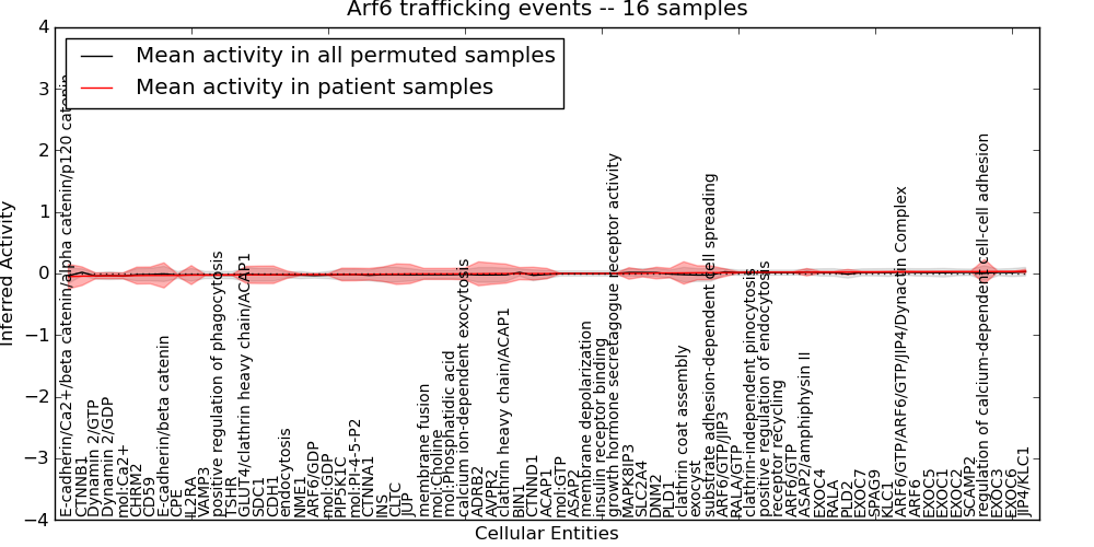 Figure S131. Get High-res Image This plot shows pathway concept perturbations across all samples against a permutation model. The concepts along the x-axis are sorted by lowest to highest mean activity for the real patient samples. Mean inferred activities are plotted along the y-axis as a colored band showing the average level and one standard deviation range. Real samples are shown in red and permuted samples in black.