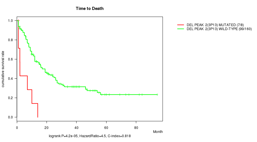 Figure S2. Get High-res Image Clustering Approach #7: 'Del Peak 2(3p13) mutation analysis' versus Clinical Feature #1: 'Time to Death'