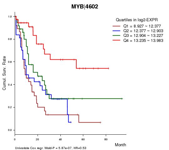 Figure S1. Get High-res Image As an example, this figure shows the association of MYB|4602 to 'Time to Death'. four curves present the cumulative survival rates of 4 quartile subsets of patients. P value = 5.87e-07 with univariate Cox regression analysis using continuous log-2 expression values.