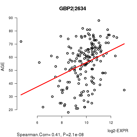 Figure S2. Get High-res Image As an example, this figure shows the association of GBP2|2634 to 'AGE'. P value = 2.1e-08 with Spearman correlation analysis. The straight line presents the best linear regression.