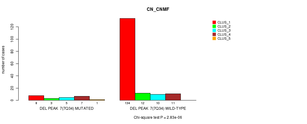 Del Peak 7(7q34) cnvs correlated to 'CN_CNMF', 'METHLYATION_CNMF', 'MIRSEQ_CNMF', and 'MIRSEQ_CHIERARCHICAL'.