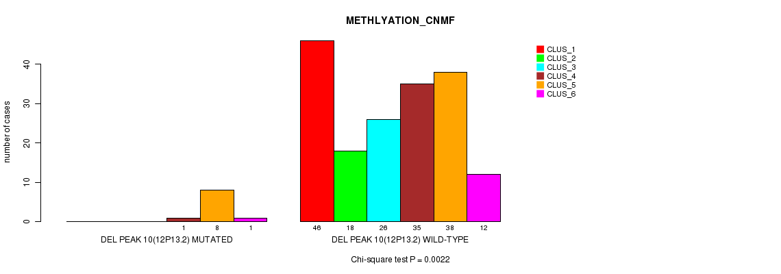 Figure S29. Get High-res Image Gene #14: 'Del Peak 10(12p13.2) mutation analysis' versus Clinical Feature #2: 'METHLYATION_CNMF'