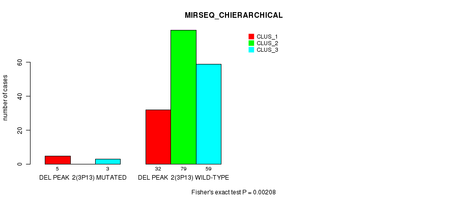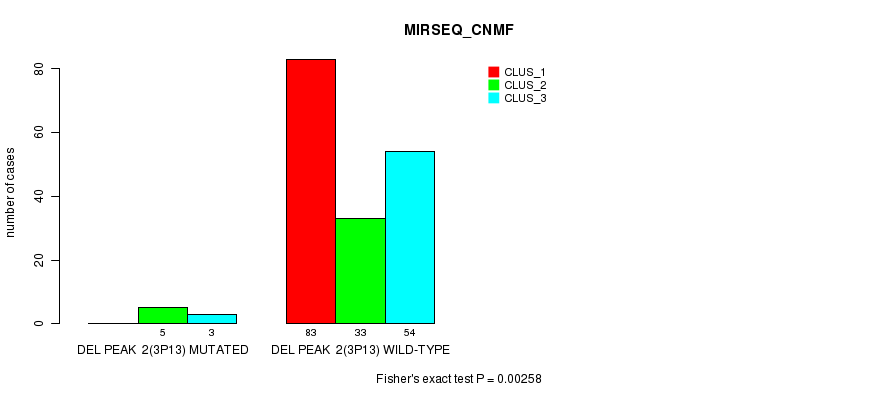 Del Peak 2(3p13) cnvs correlated to 'CN_CNMF', 'MIRSEQ_CNMF', and 'MIRSEQ_CHIERARCHICAL'.