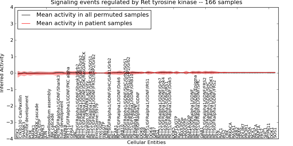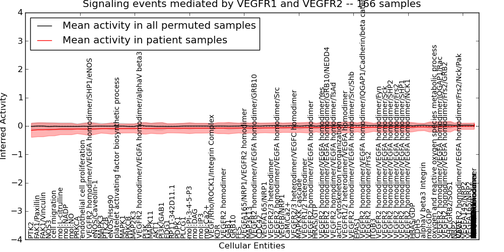 Figure S131. Get High-res Image This plot shows pathway concept perturbations across all samples against a permutation model. The concepts along the x-axis are sorted by lowest to highest mean activity for the real patient samples. Mean inferred activities are plotted along the y-axis as a colored band showing the average level and one standard deviation range. Real samples are shown in red and permuted samples in black.