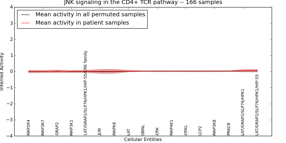 Figure S128. Get High-res Image This plot shows pathway concept perturbations across all samples against a permutation model. The concepts along the x-axis are sorted by lowest to highest mean activity for the real patient samples. Mean inferred activities are plotted along the y-axis as a colored band showing the average level and one standard deviation range. Real samples are shown in red and permuted samples in black.