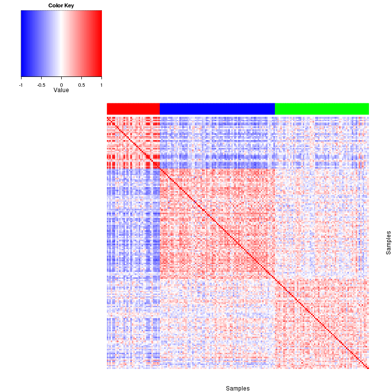Figure 4. The consensus matrix after clustering shows 3 robust clusters with limited overlap between clusters.