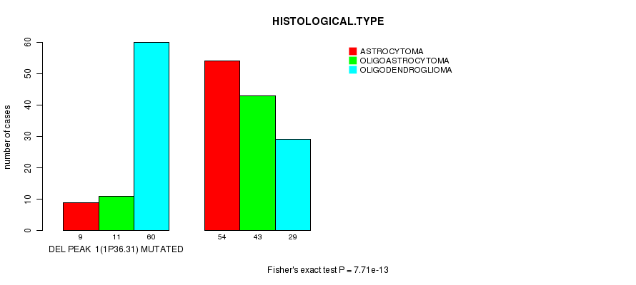 2 subtypes identified in current cancer cohort by 'Del Peak 1(1p36.31) mutation analysis'. These subtypes correlate to 'HISTOLOGICAL.TYPE'.