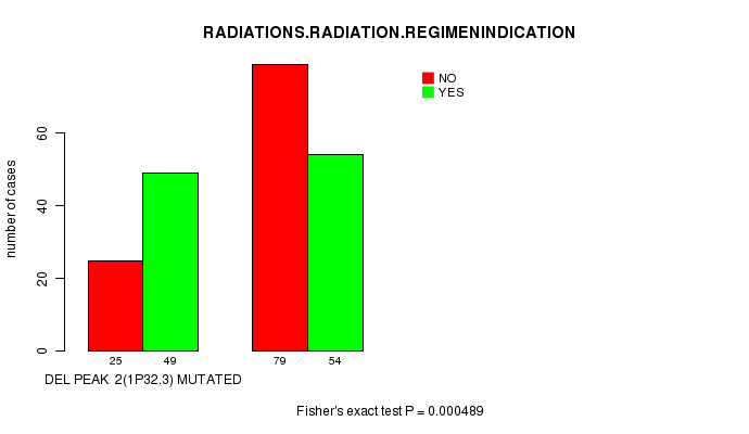 2 subtypes identified in current cancer cohort by 'Del Peak 2(1p32.3) mutation analysis'. These subtypes correlate to 'HISTOLOGICAL.TYPE' and 'RADIATIONS.RADIATION.REGIMENINDICATION'.