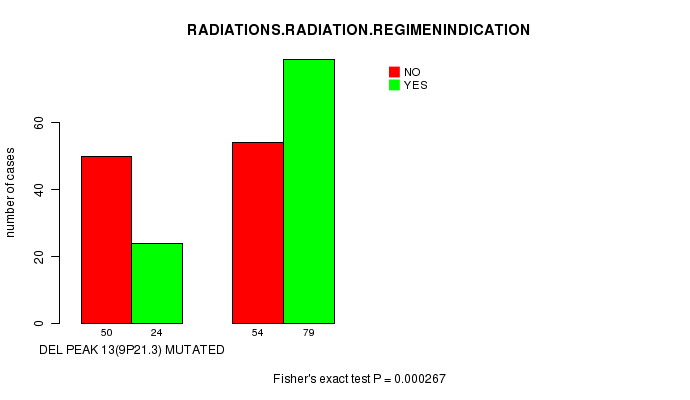 Table S40. Clustering Approach #28: 'Del Peak 13(9p21.3) mutation analysis' versus Clinical Feature #6: 'RADIATIONS.RADIATION.REGIMENINDICATION'