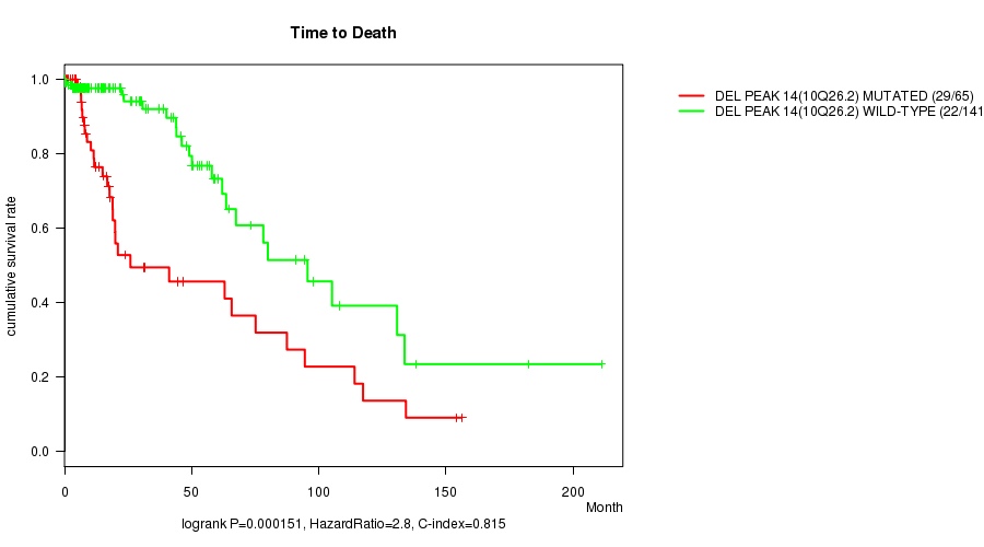 2 subtypes identified in current cancer cohort by 'Del Peak 14(10q26.2) mutation analysis'. These subtypes correlate to 'Time to Death'.
