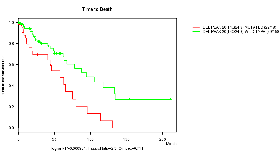 2 subtypes identified in current cancer cohort by 'Del Peak 20(14q24.3) mutation analysis'. These subtypes correlate to 'Time to Death'.