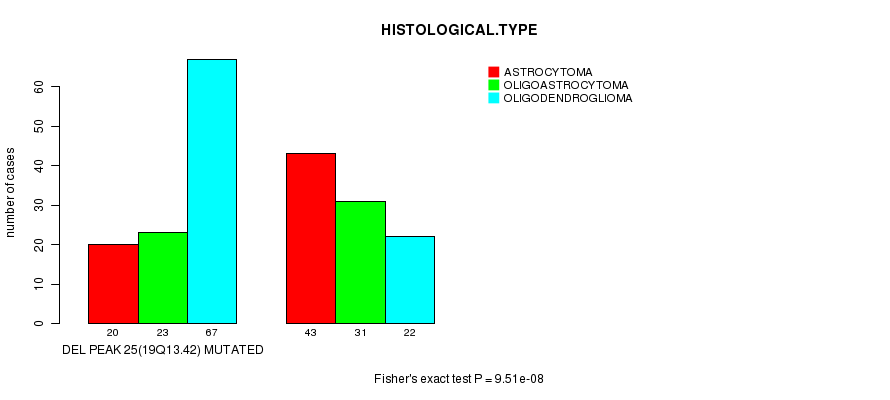 2 subtypes identified in current cancer cohort by 'Del Peak 25(19q13.42) mutation analysis'. These subtypes correlate to 'HISTOLOGICAL.TYPE'.