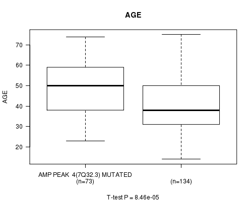 2 subtypes identified in current cancer cohort by 'Amp Peak 4(7q32.3) mutation analysis'. These subtypes correlate to 'AGE'.
