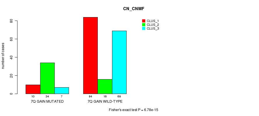 7q gain cnv correlated to 'CN_CNMF', 'METHLYATION_CNMF', and 'MRNASEQ_CNMF'.