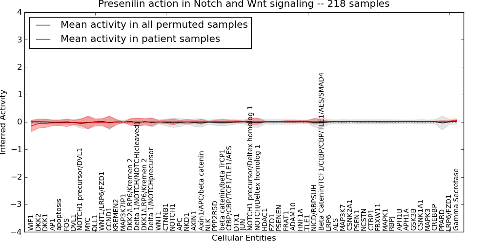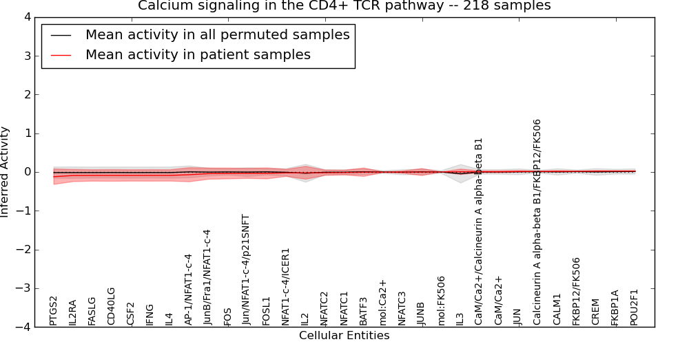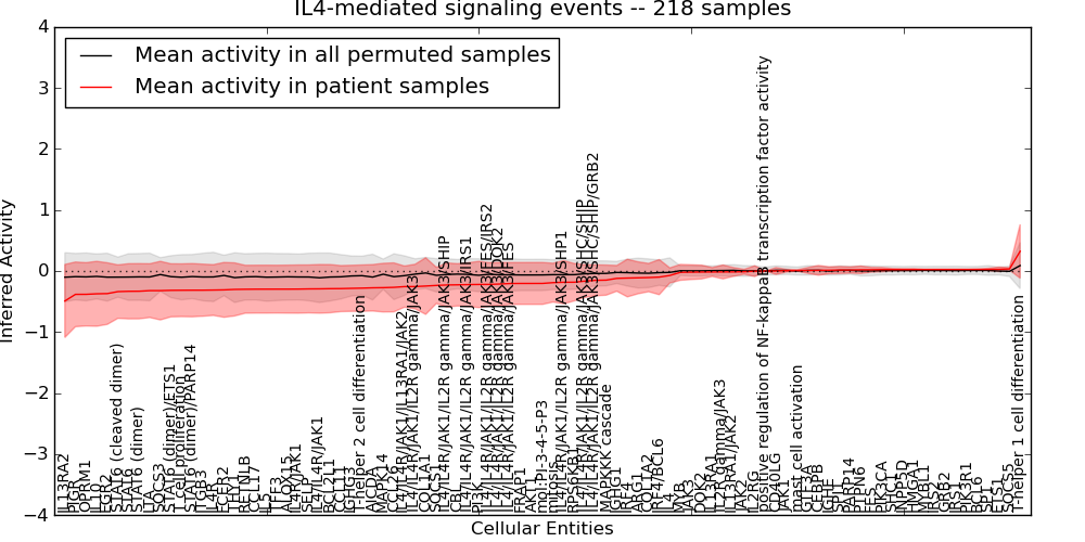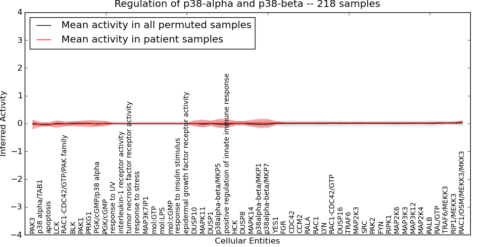 Figure S131. Get High-res Image This plot shows pathway concept perturbations across all samples against a permutation model. The concepts along the x-axis are sorted by lowest to highest mean activity for the real patient samples. Mean inferred activities are plotted along the y-axis as a colored band showing the average level and one standard deviation range. Real samples are shown in red and permuted samples in black.
