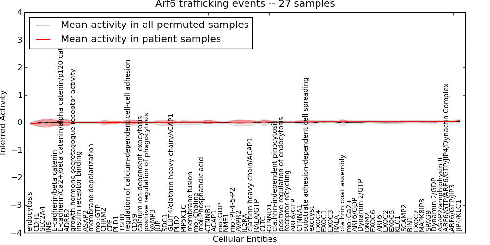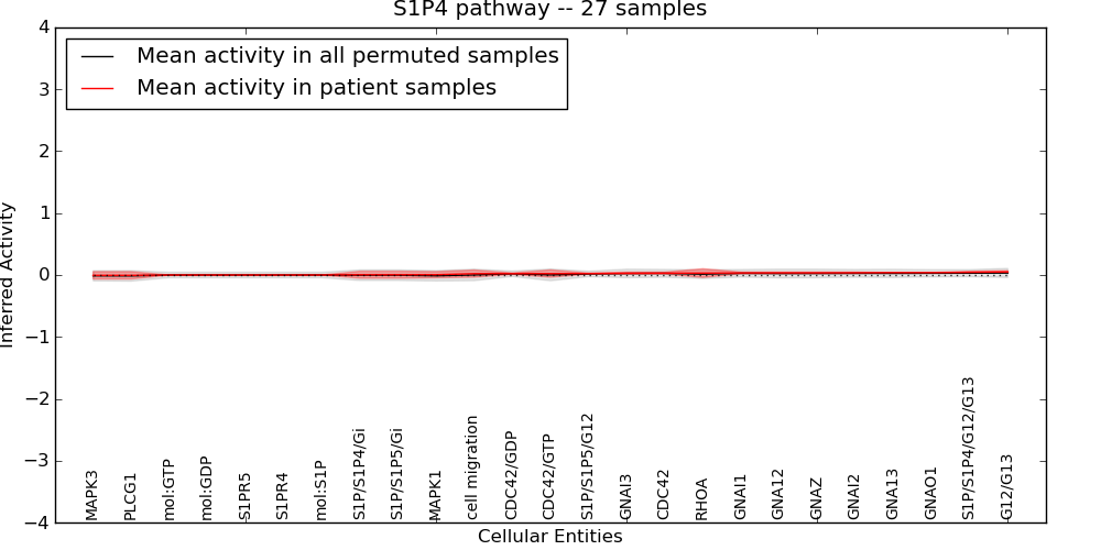 Figure S131. Get High-res Image This plot shows pathway concept perturbations across all samples against a permutation model. The concepts along the x-axis are sorted by lowest to highest mean activity for the real patient samples. Mean inferred activities are plotted along the y-axis as a colored band showing the average level and one standard deviation range. Real samples are shown in red and permuted samples in black.