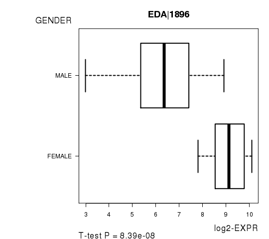 Figure S2. Get High-res Image As an example, this figure shows the association of EDA|1896 to 'GENDER'. P value = 8.39e-08 with T-test analysis.