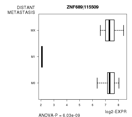 Figure S3. Get High-res Image As an example, this figure shows the association of ZNF689|115509 to 'DISTANT.METASTASIS'. P value = 6.03e-09 with ANOVA analysis.