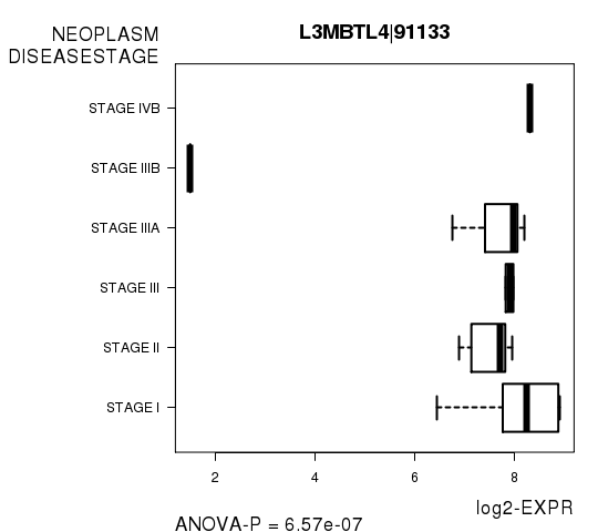 Figure S5. Get High-res Image As an example, this figure shows the association of L3MBTL4|91133 to 'NEOPLASM.DISEASESTAGE'. P value = 6.57e-07 with ANOVA analysis.