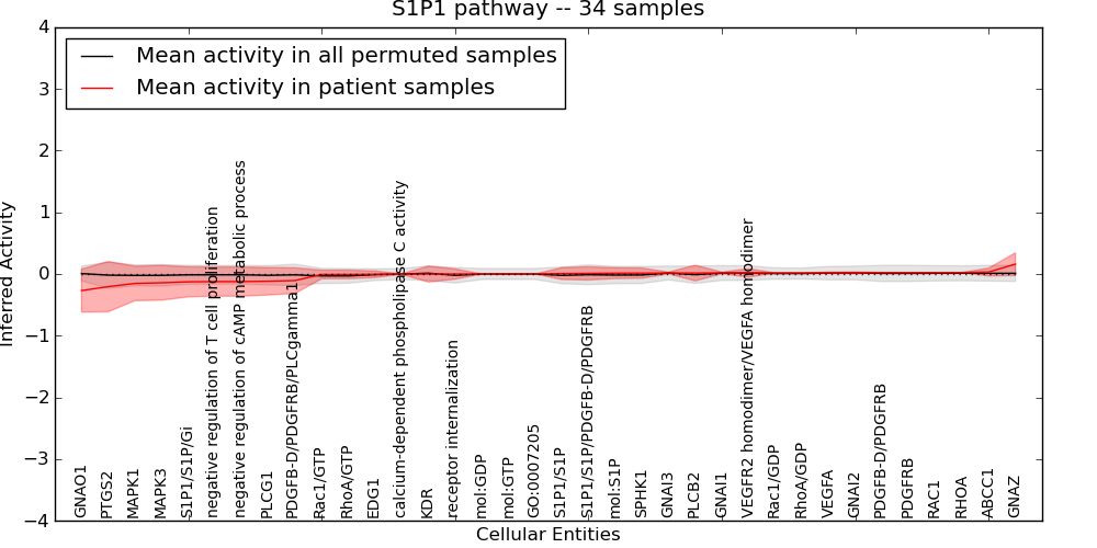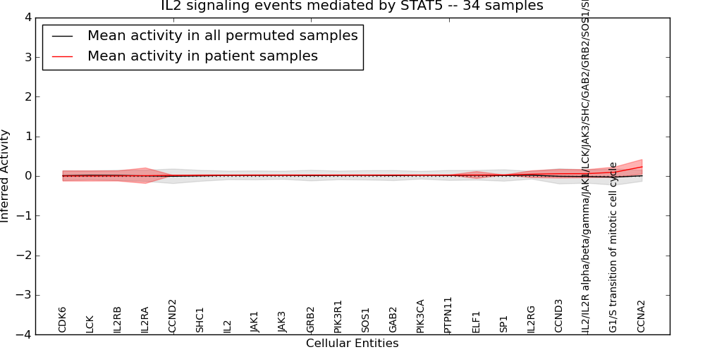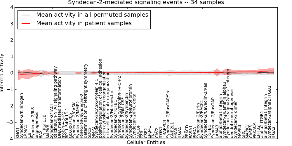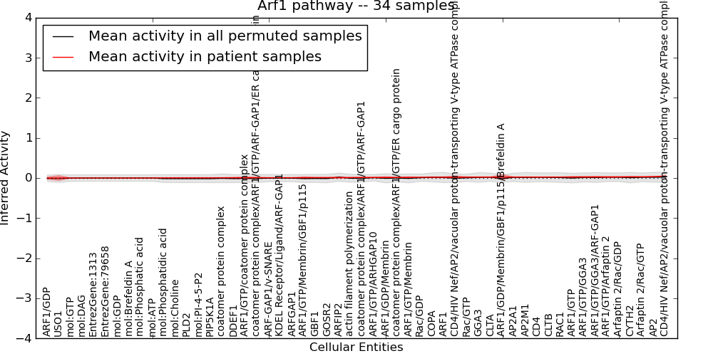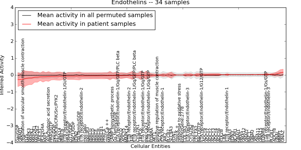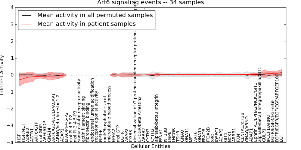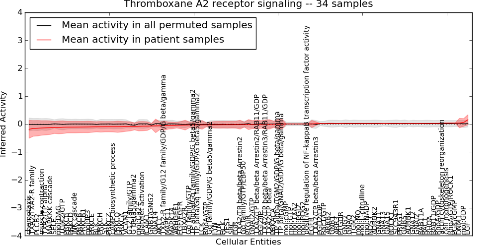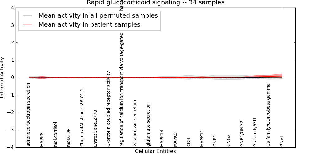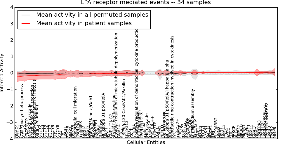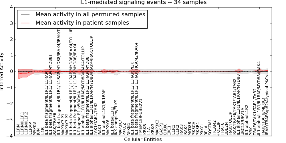 Figure S130. Get High-res Image This plot shows pathway concept perturbations across all samples against a permutation model. The concepts along the x-axis are sorted by lowest to highest mean activity for the real patient samples. Mean inferred activities are plotted along the y-axis as a colored band showing the average level and one standard deviation range. Real samples are shown in red and permuted samples in black.