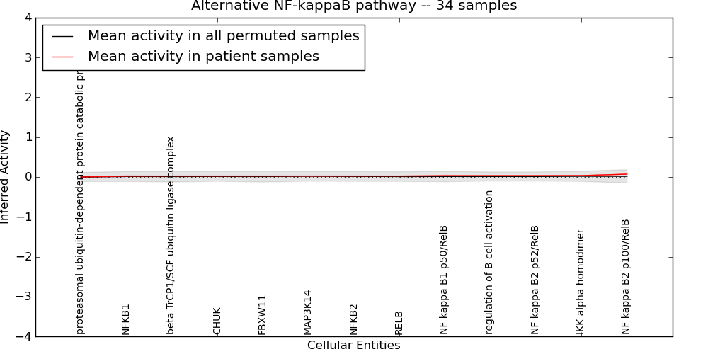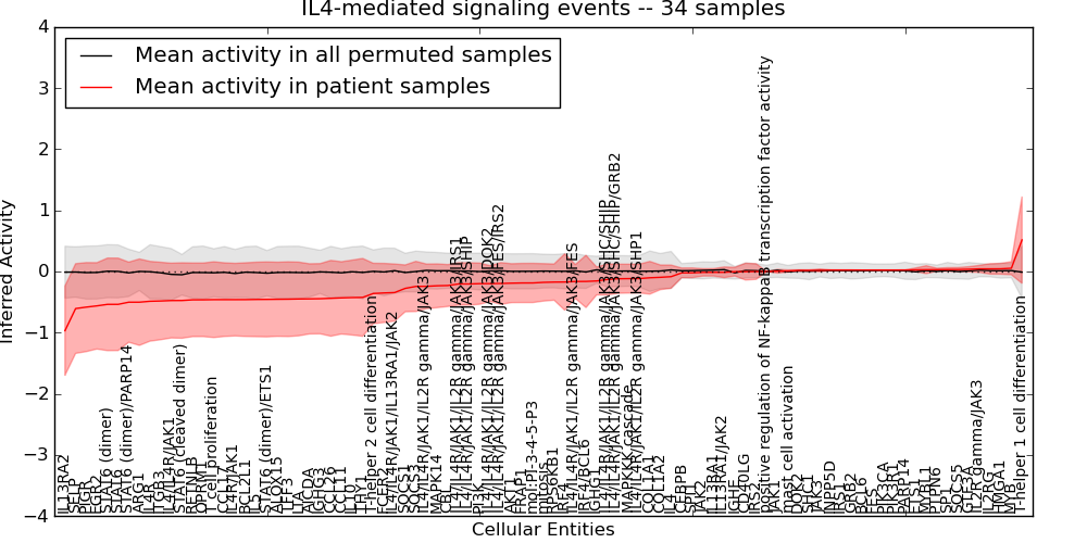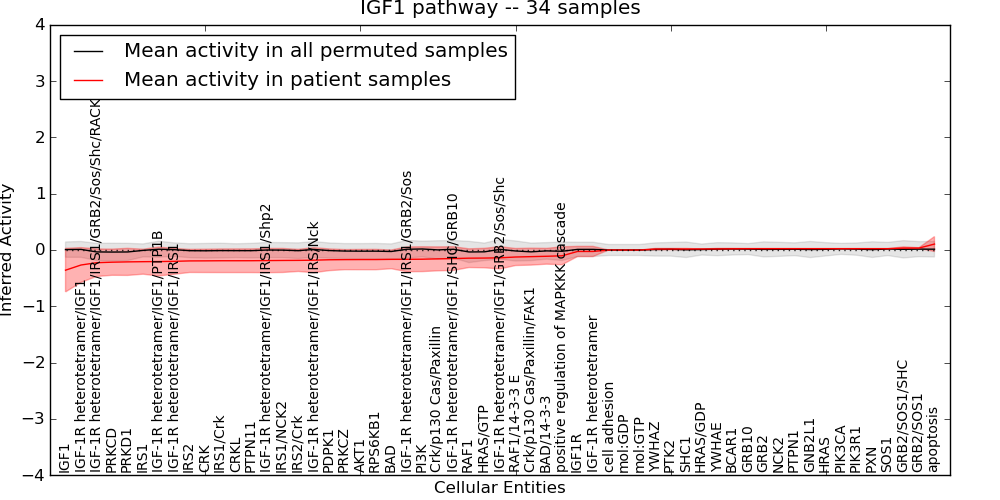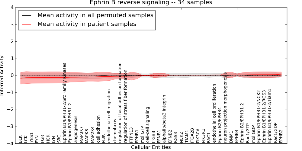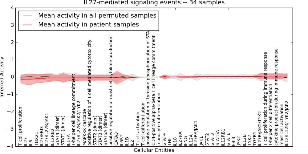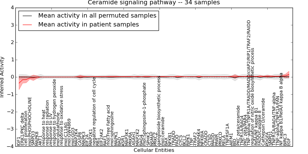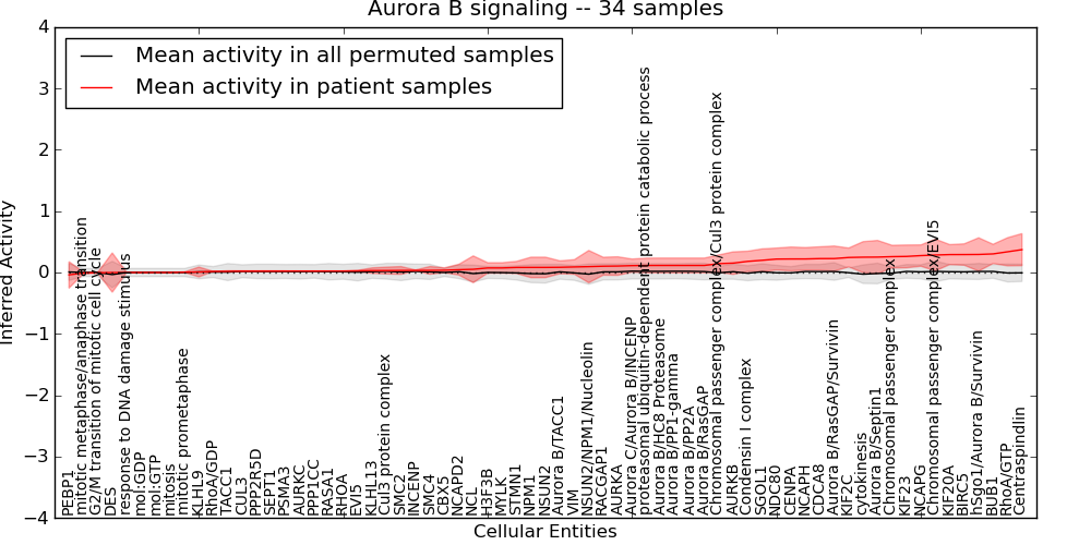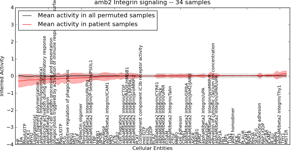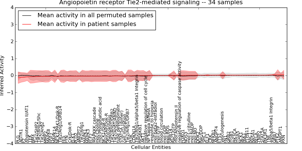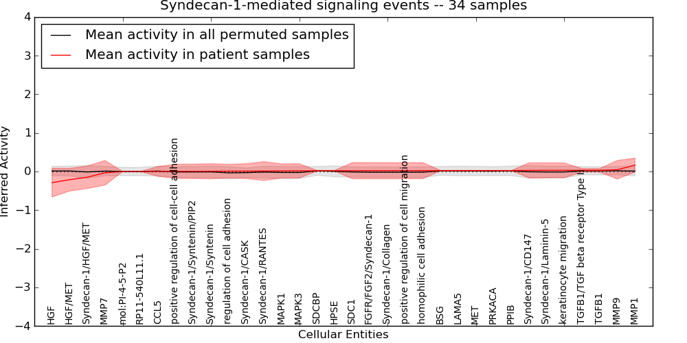 Figure S130. Get High-res Image This plot shows pathway concept perturbations across all samples against a permutation model. The concepts along the x-axis are sorted by lowest to highest mean activity for the real patient samples. Mean inferred activities are plotted along the y-axis as a colored band showing the average level and one standard deviation range. Real samples are shown in red and permuted samples in black.