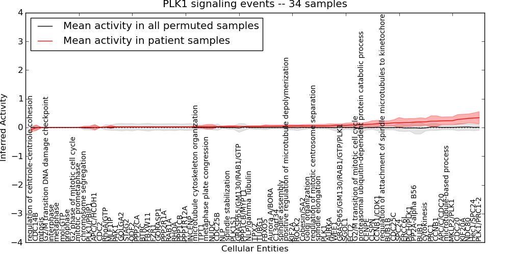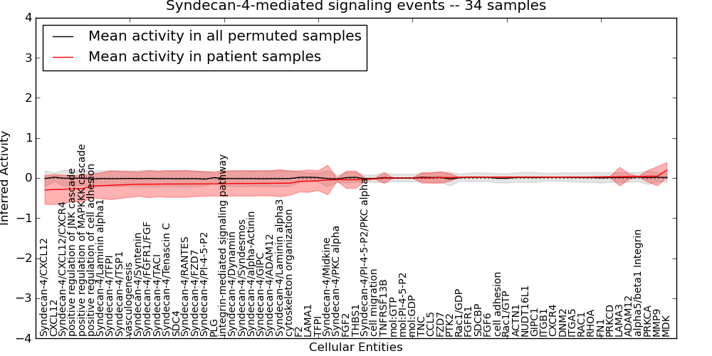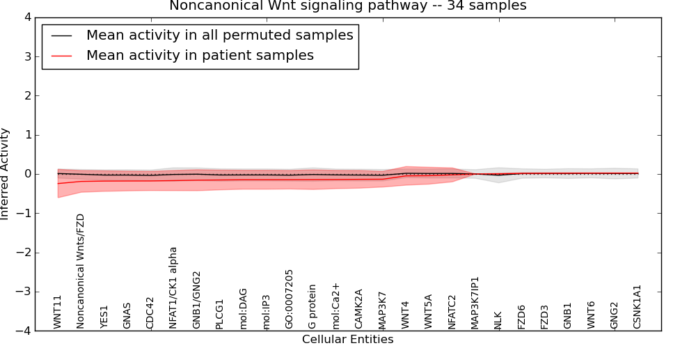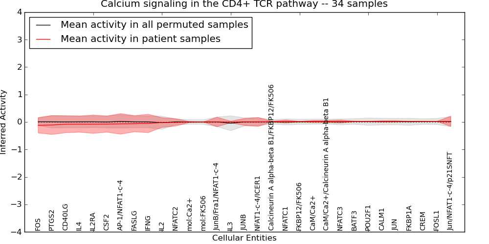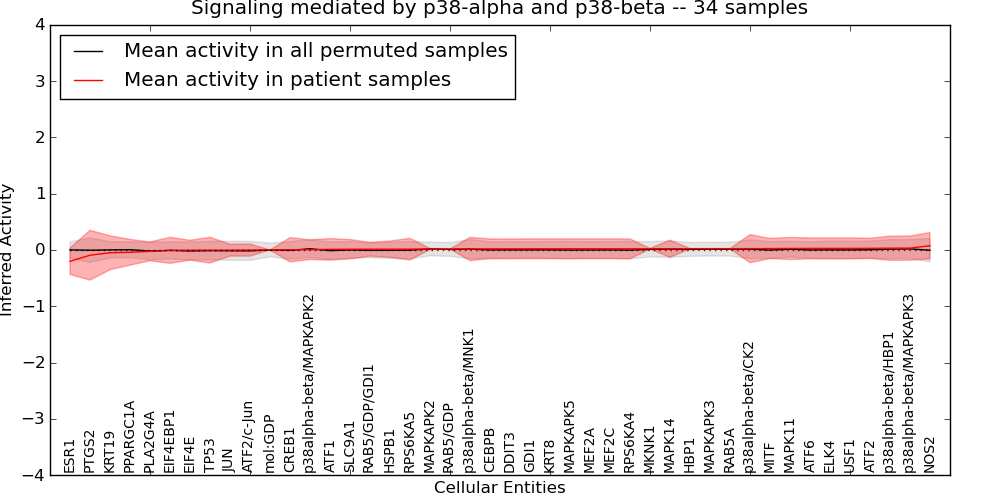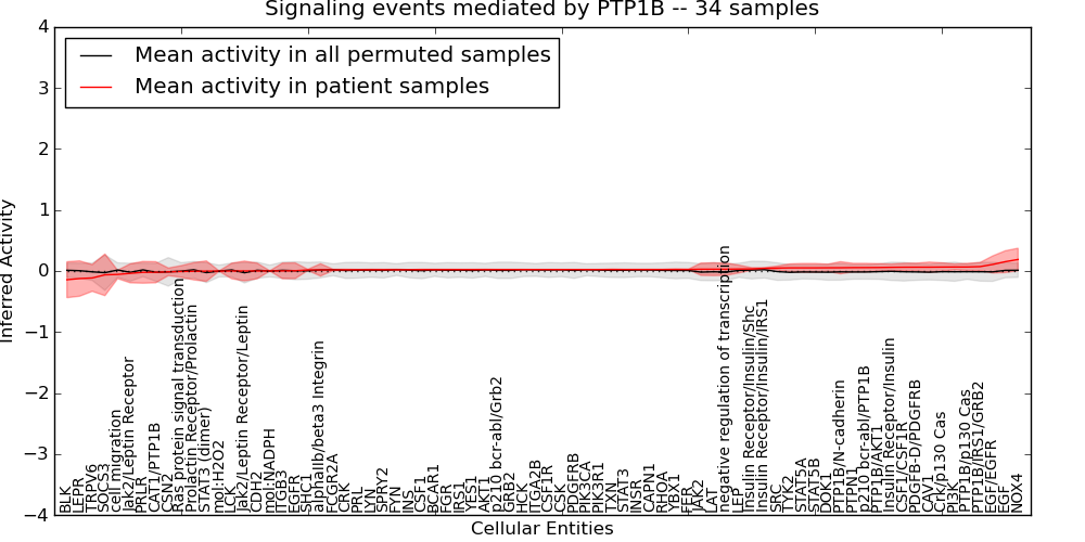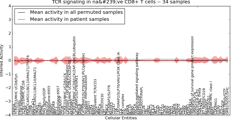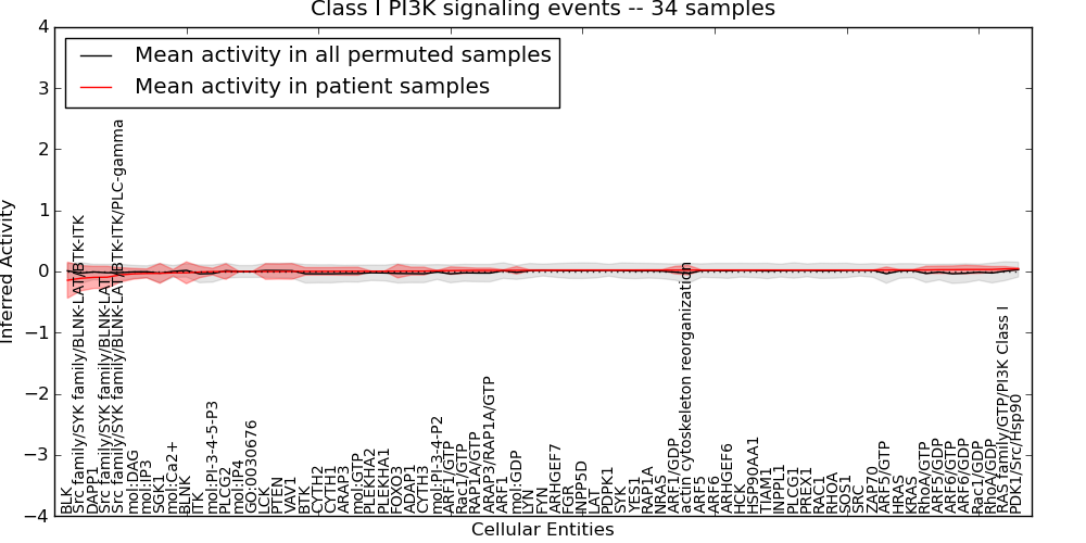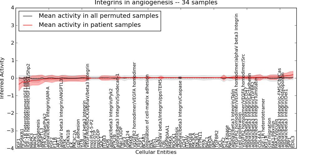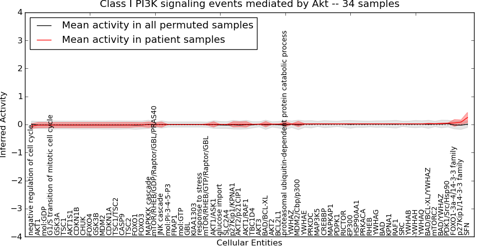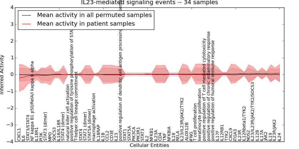 Figure S130. Get High-res Image This plot shows pathway concept perturbations across all samples against a permutation model. The concepts along the x-axis are sorted by lowest to highest mean activity for the real patient samples. Mean inferred activities are plotted along the y-axis as a colored band showing the average level and one standard deviation range. Real samples are shown in red and permuted samples in black.