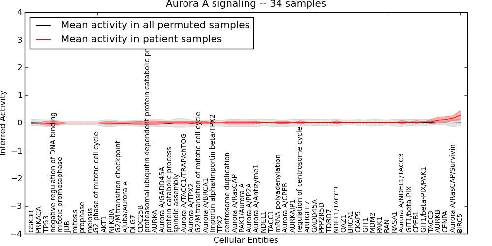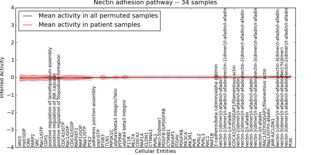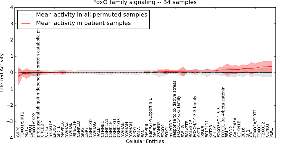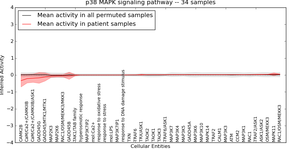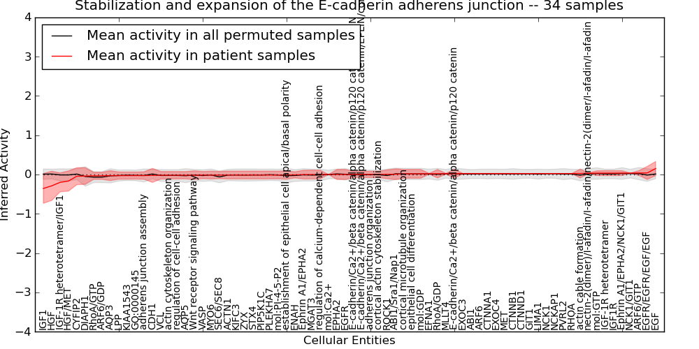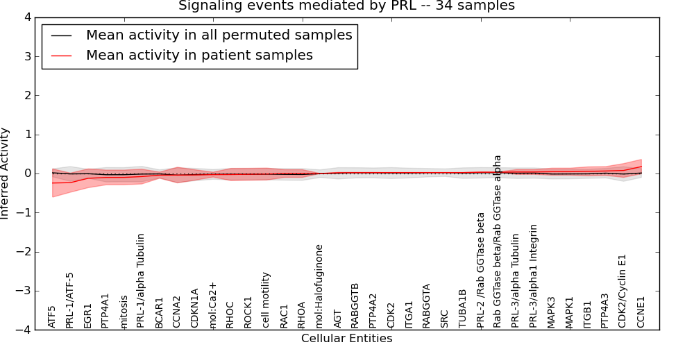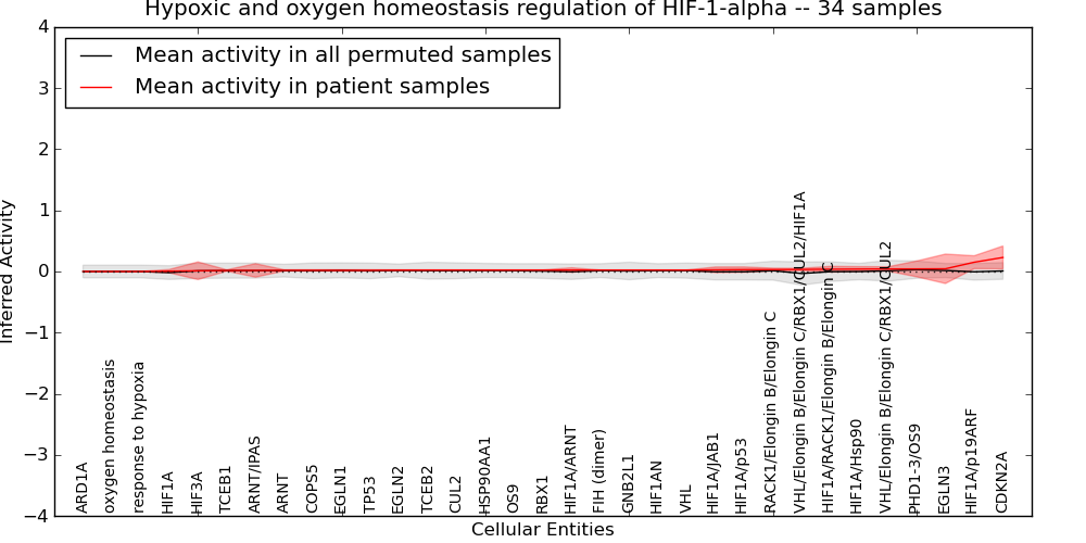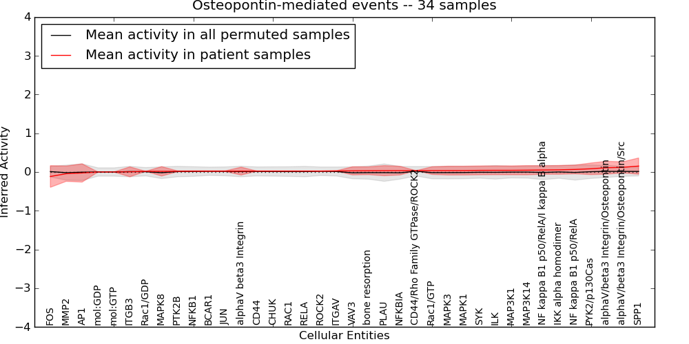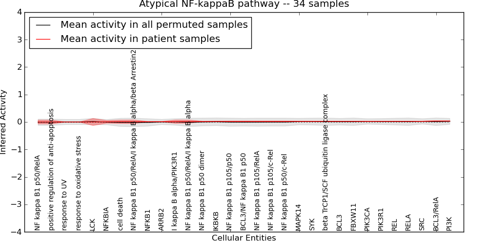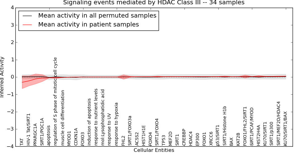 Figure S130. Get High-res Image This plot shows pathway concept perturbations across all samples against a permutation model. The concepts along the x-axis are sorted by lowest to highest mean activity for the real patient samples. Mean inferred activities are plotted along the y-axis as a colored band showing the average level and one standard deviation range. Real samples are shown in red and permuted samples in black.