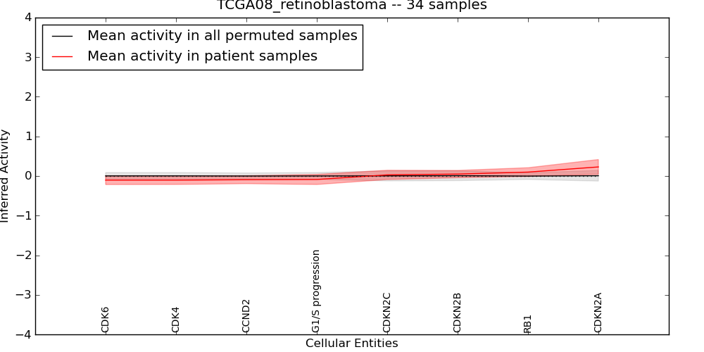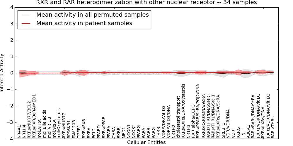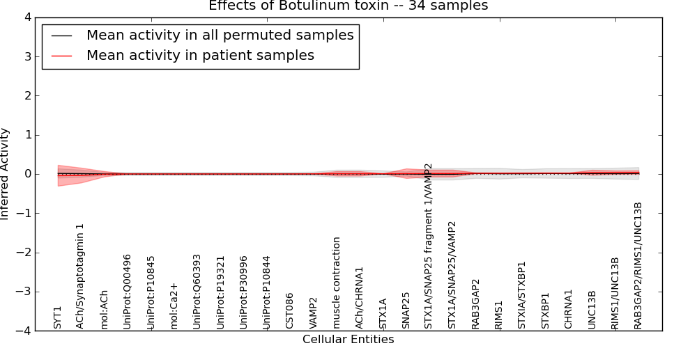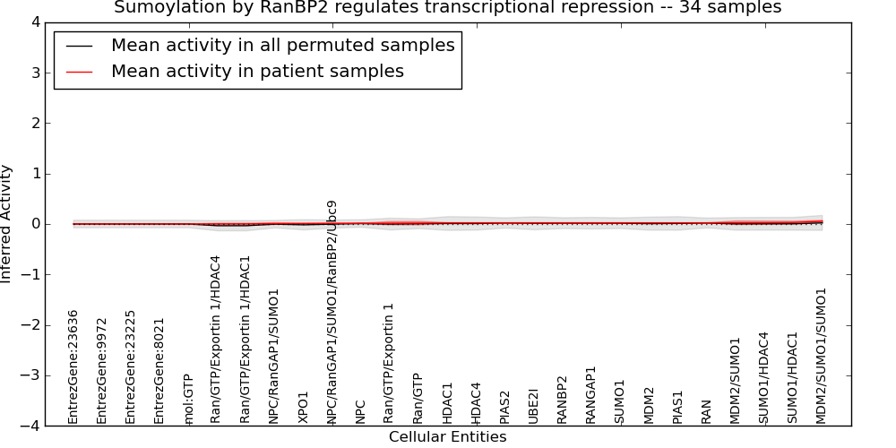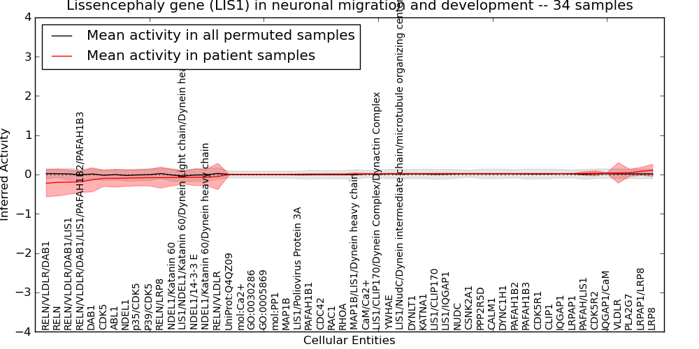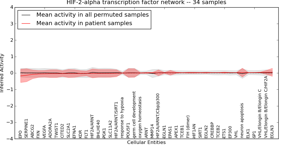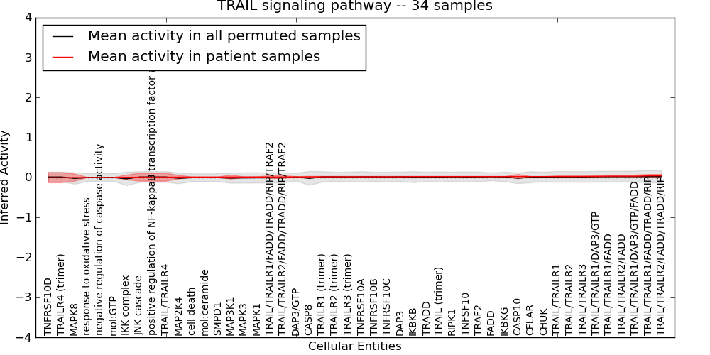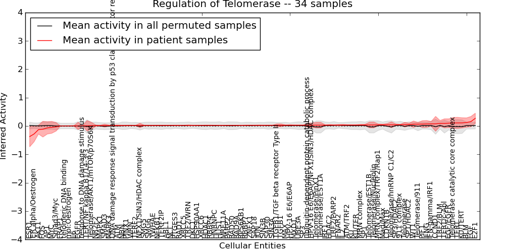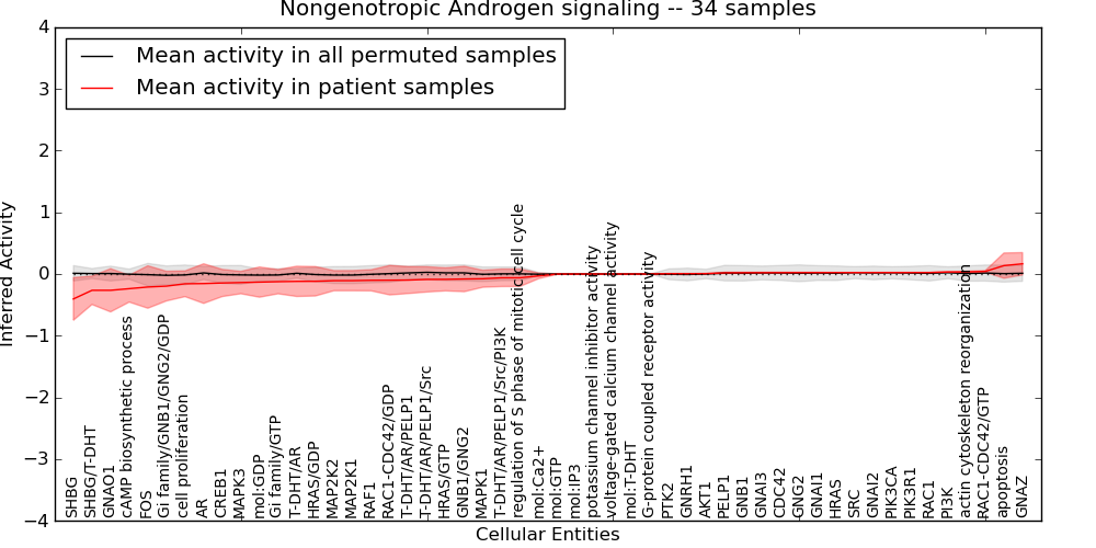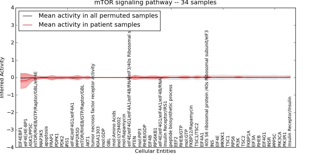 Figure S130. Get High-res Image This plot shows pathway concept perturbations across all samples against a permutation model. The concepts along the x-axis are sorted by lowest to highest mean activity for the real patient samples. Mean inferred activities are plotted along the y-axis as a colored band showing the average level and one standard deviation range. Real samples are shown in red and permuted samples in black.