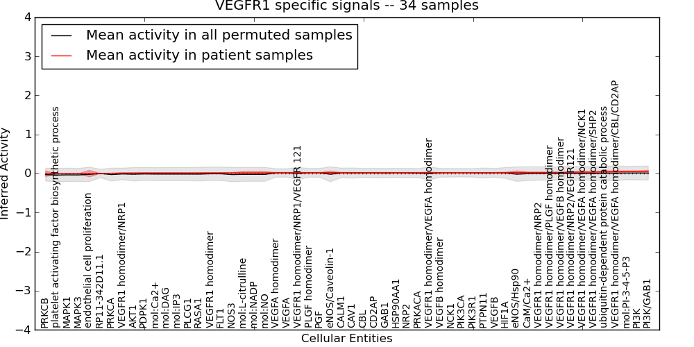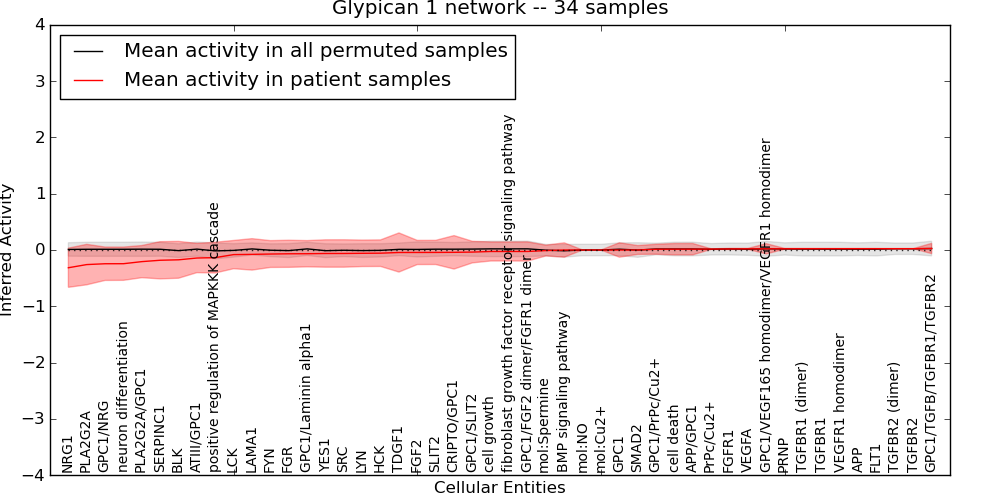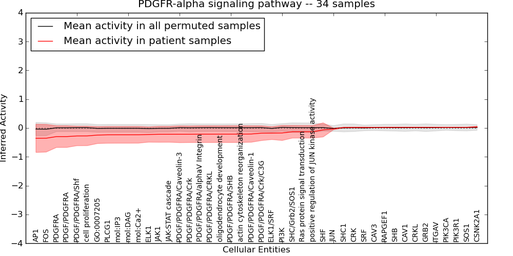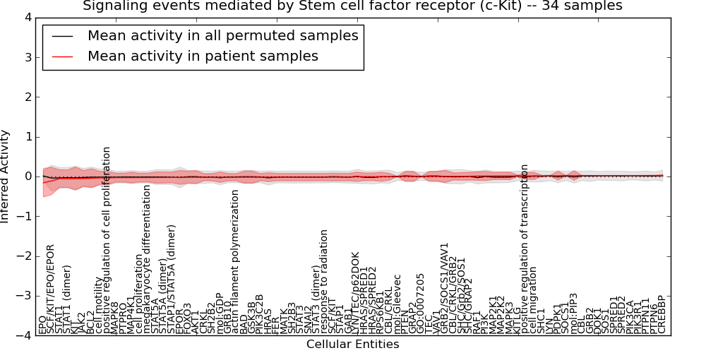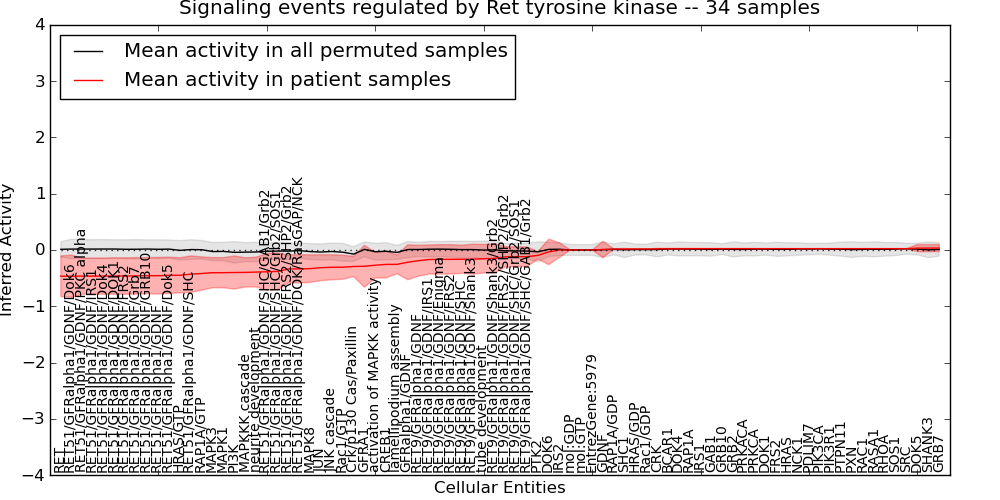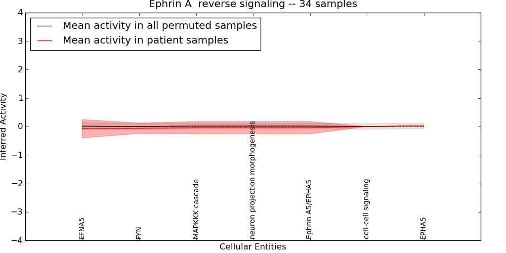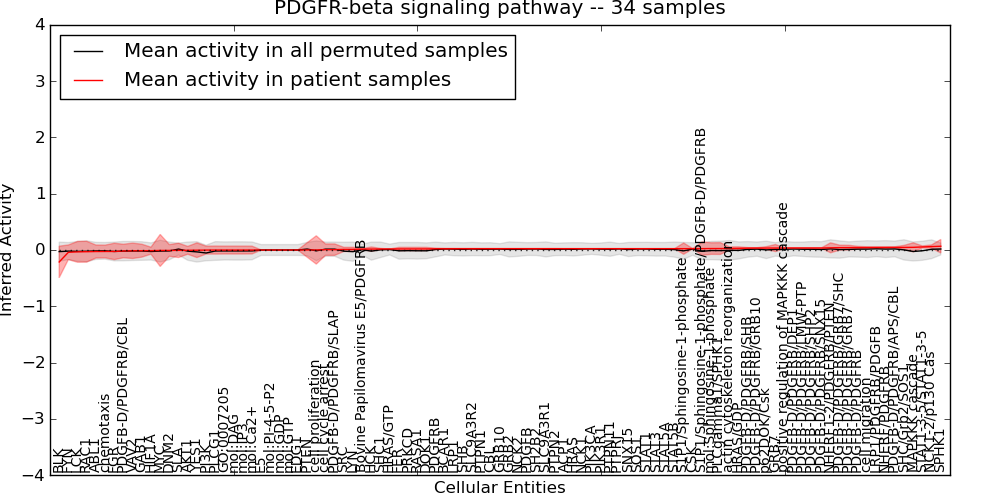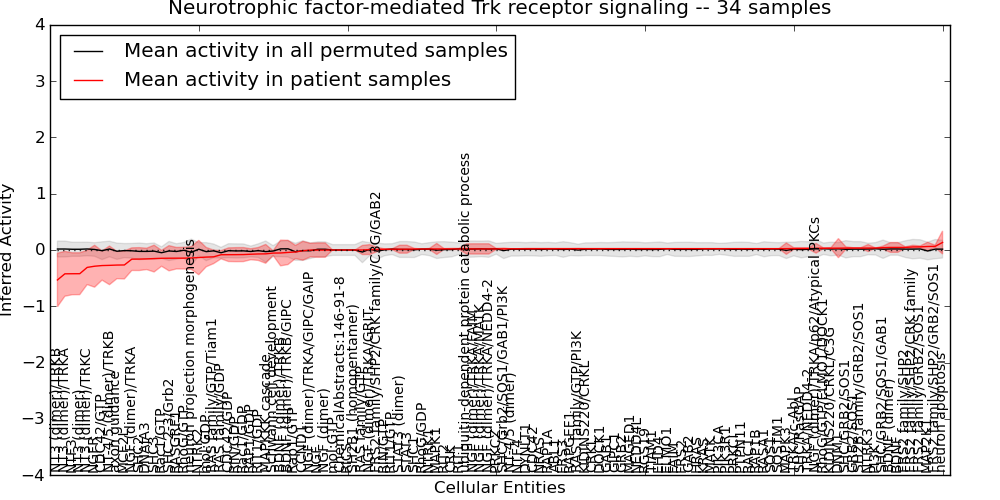 Figure S131. Get High-res Image This plot shows pathway concept perturbations across all samples against a permutation model. The concepts along the x-axis are sorted by lowest to highest mean activity for the real patient samples. Mean inferred activities are plotted along the y-axis as a colored band showing the average level and one standard deviation range. Real samples are shown in red and permuted samples in black.