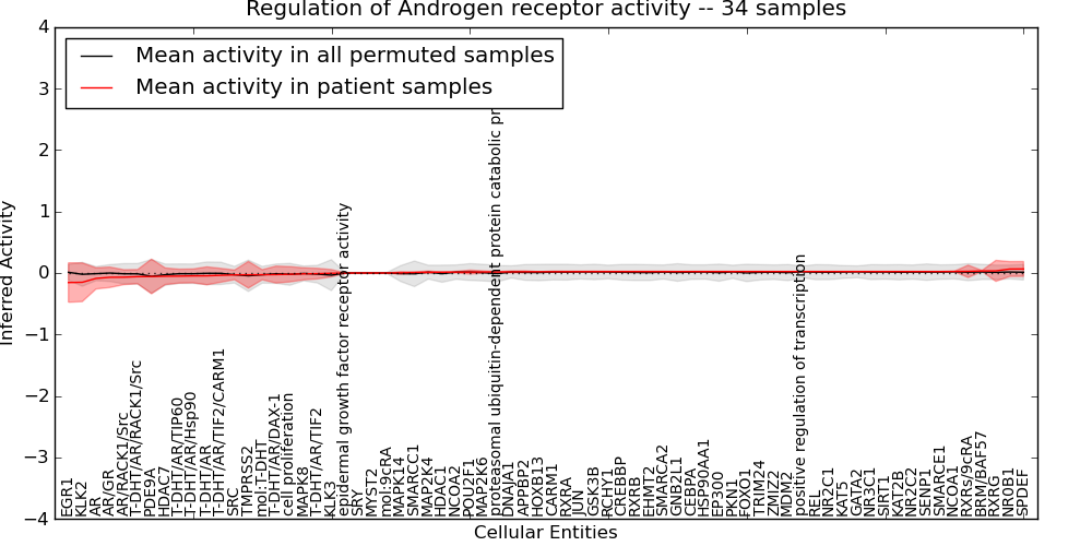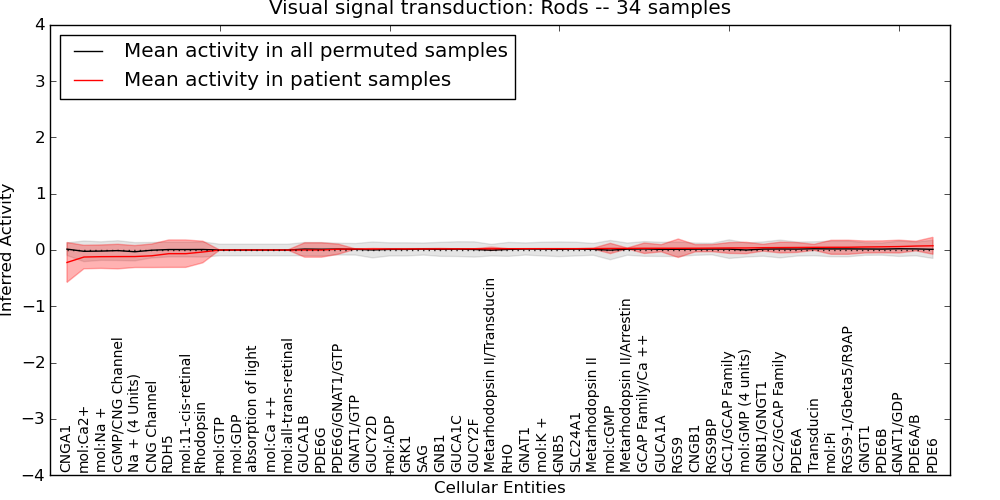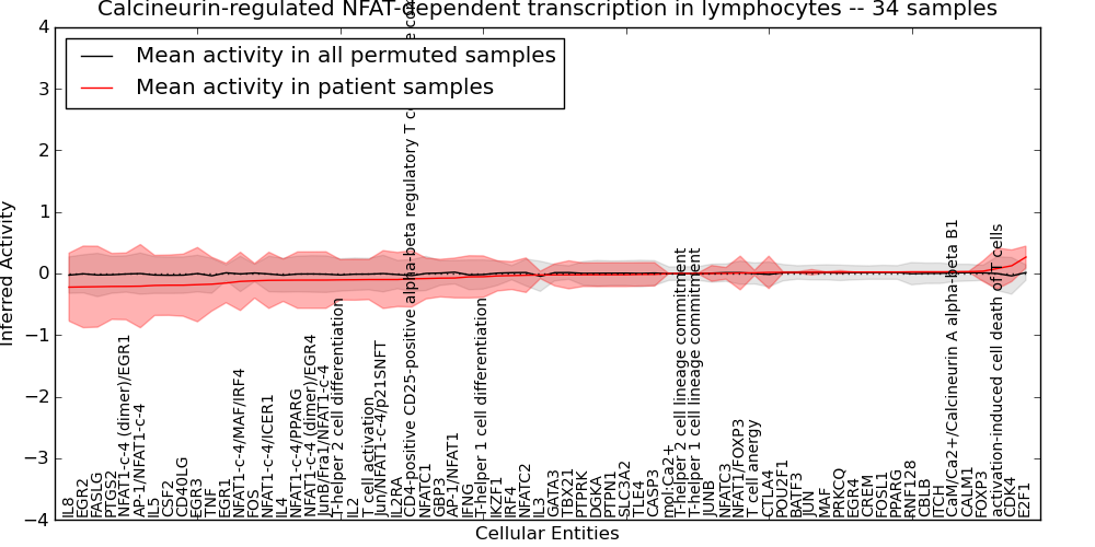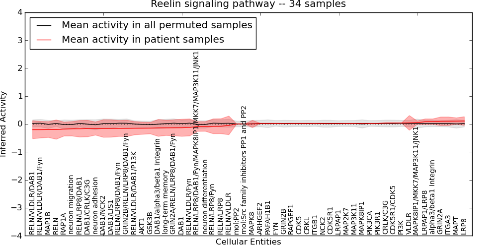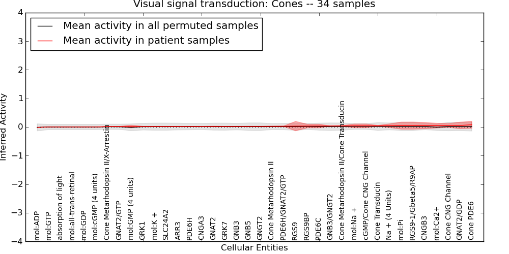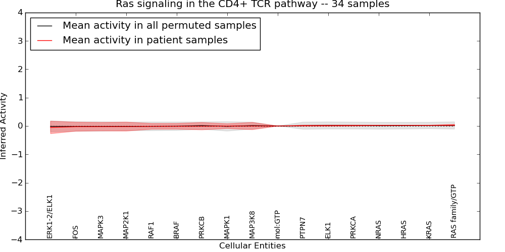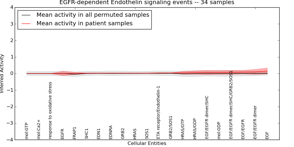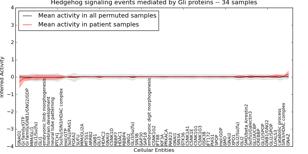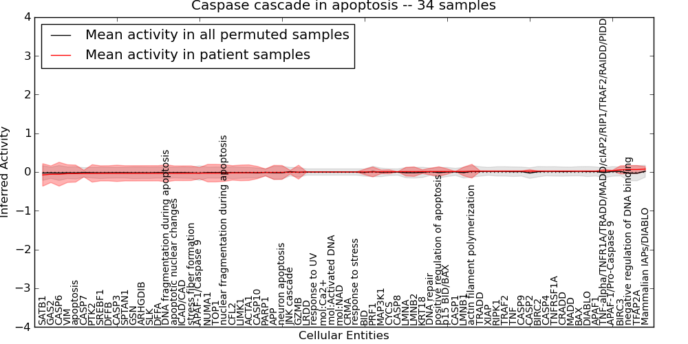 Figure S131. Get High-res Image This plot shows pathway concept perturbations across all samples against a permutation model. The concepts along the x-axis are sorted by lowest to highest mean activity for the real patient samples. Mean inferred activities are plotted along the y-axis as a colored band showing the average level and one standard deviation range. Real samples are shown in red and permuted samples in black.