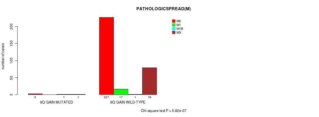 2 subtypes identified in current cancer cohort by '9q gain mutation analysis'. These subtypes correlate to 'PATHOLOGICSPREAD(M)'.