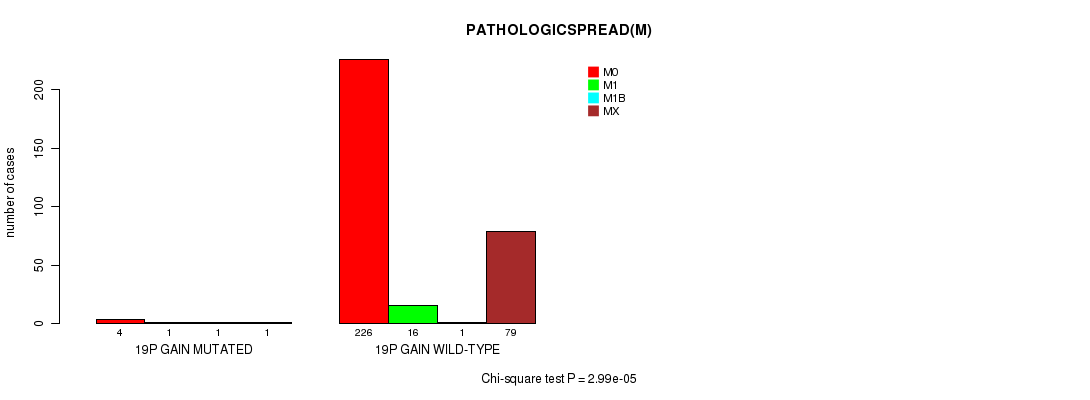 2 subtypes identified in current cancer cohort by '19p gain mutation analysis'. These subtypes correlate to 'PATHOLOGICSPREAD(M)'.