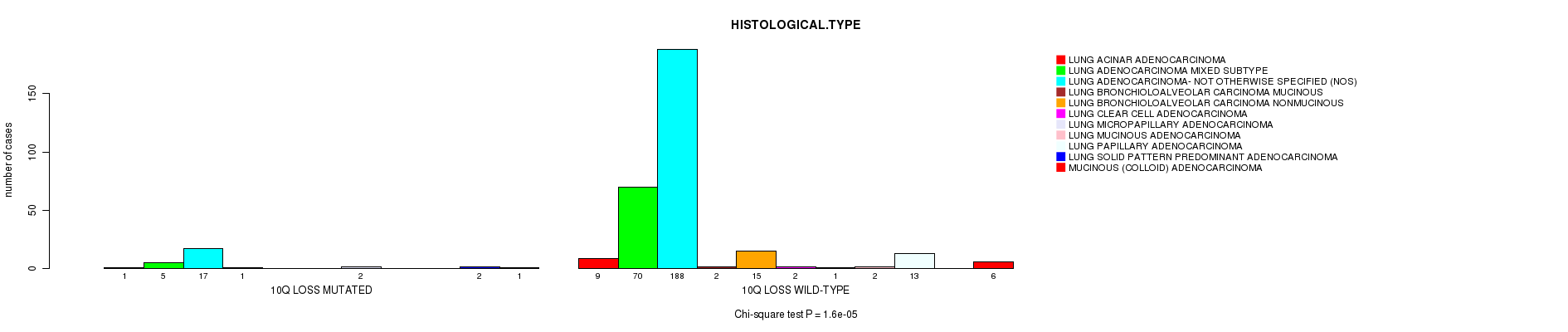 2 subtypes identified in current cancer cohort by '10q loss mutation analysis'. These subtypes correlate to 'HISTOLOGICAL.TYPE'.