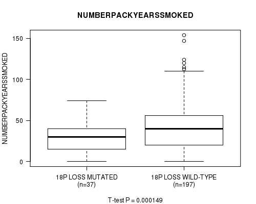 2 subtypes identified in current cancer cohort by '18p loss mutation analysis'. These subtypes correlate to 'NUMBERPACKYEARSSMOKED'.