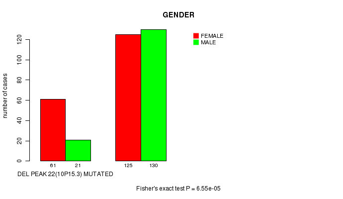 Figure S7. Get High-res Image Clustering Approach #54: 'Del Peak 22(10p15.3) mutation analysis' versus Clinical Feature #3: 'GENDER'