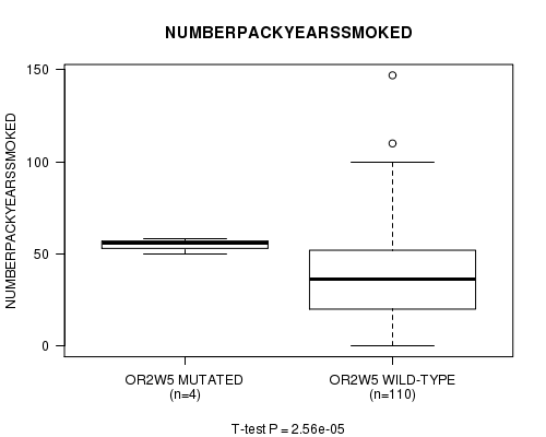 OR2W5 mutation correlated to 'NUMBERPACKYEARSSMOKED'.