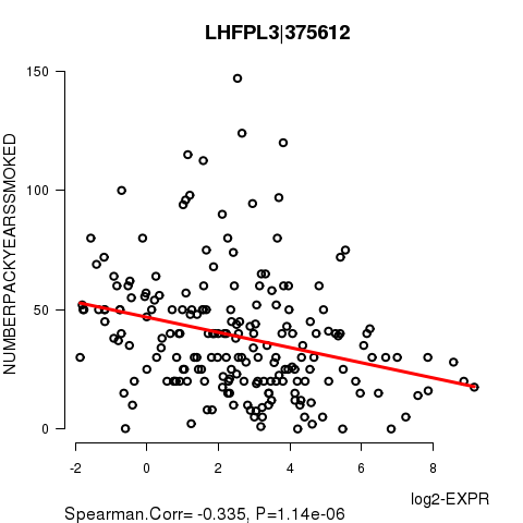 Figure S8. Get High-res Image As an example, this figure shows the association of LHFPL3|375612 to 'NUMBERPACKYEARSSMOKED'. P value = 1.14e-06 with Spearman correlation analysis. The straight line presents the best linear regression.