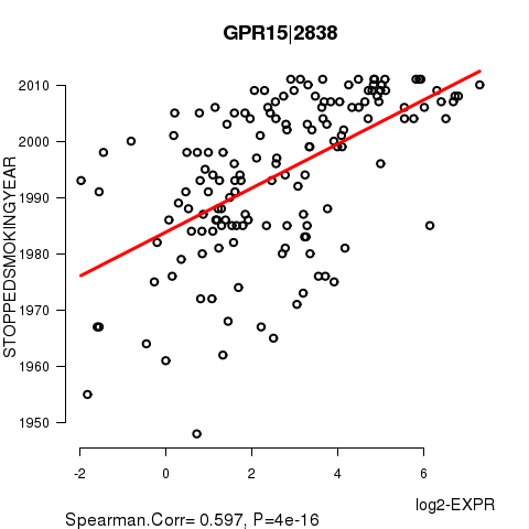 Figure S9. Get High-res Image As an example, this figure shows the association of GPR15|2838 to 'STOPPEDSMOKINGYEAR'. P value = 4e-16 with Spearman correlation analysis. The straight line presents the best linear regression.