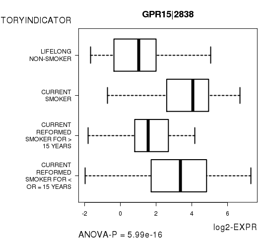 Figure S10. Get High-res Image As an example, this figure shows the association of GPR15|2838 to 'TOBACCOSMOKINGHISTORYINDICATOR'. P value = 5.99e-16 with ANOVA analysis.
