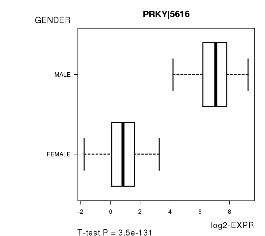 Figure S2. Get High-res Image As an example, this figure shows the association of PRKY|5616 to 'GENDER'. P value = 3.5e-131 with T-test analysis.