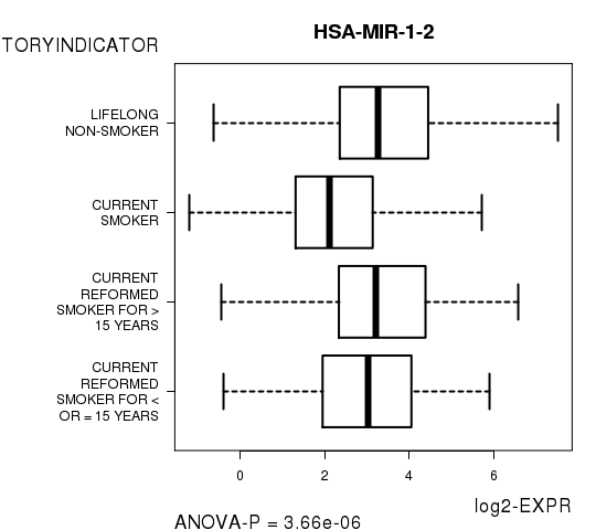 Figure S5. Get High-res Image As an example, this figure shows the association of HSA-MIR-1-2 to 'TOBACCOSMOKINGHISTORYINDICATOR'. P value = 3.66e-06 with ANOVA analysis.