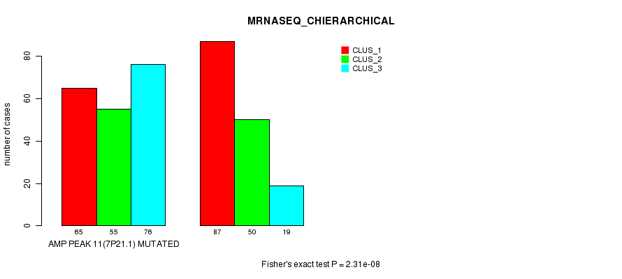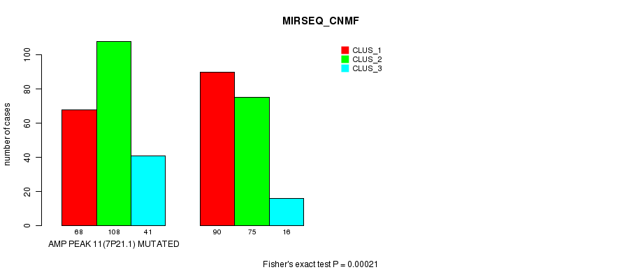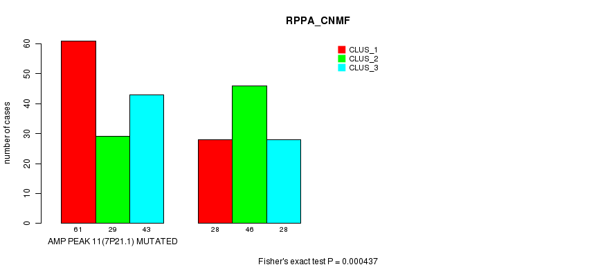 Amp Peak 11(7p21.1) cnvs correlated to 'CN_CNMF', 'RPPA_CNMF', 'MRNASEQ_CNMF', 'MRNASEQ_CHIERARCHICAL', 'MIRSEQ_CNMF', and 'MIRSEQ_CHIERARCHICAL'.