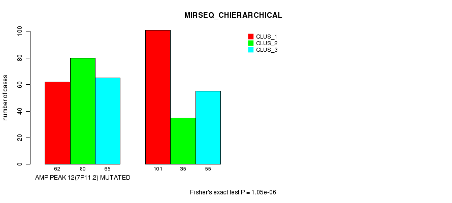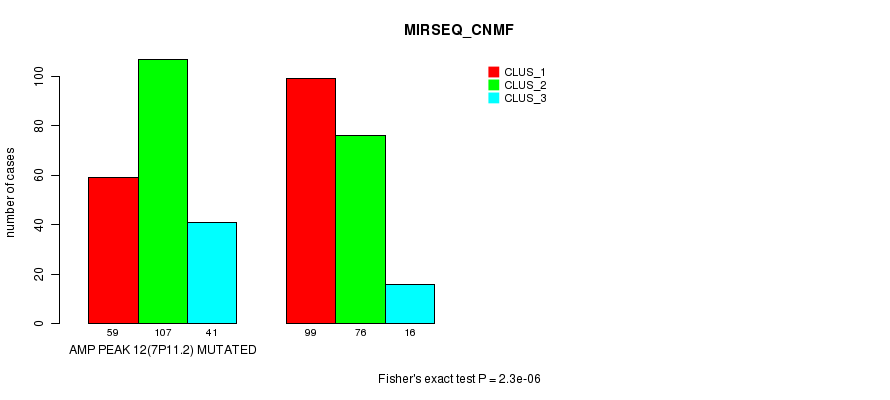 Amp Peak 12(7p11.2) cnvs correlated to 'CN_CNMF', 'RPPA_CNMF', 'RPPA_CHIERARCHICAL', 'MRNASEQ_CNMF', 'MRNASEQ_CHIERARCHICAL', 'MIRSEQ_CNMF', and 'MIRSEQ_CHIERARCHICAL'.