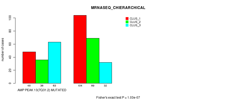 Amp Peak 13(7q31.2) cnvs correlated to 'CN_CNMF', 'MRNASEQ_CNMF', and 'MRNASEQ_CHIERARCHICAL'.