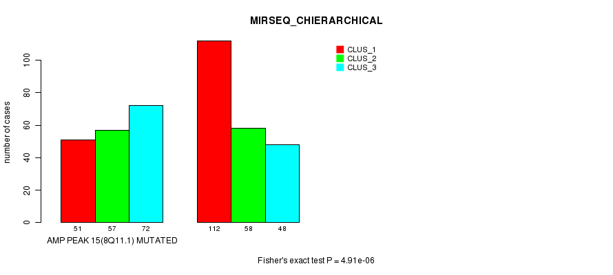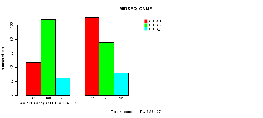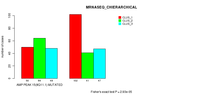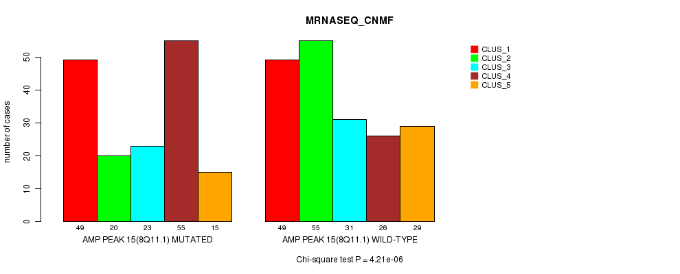 Amp Peak 15(8q11.1) cnvs correlated to 'CN_CNMF', 'METHLYATION_CNMF', 'MRNASEQ_CNMF', 'MRNASEQ_CHIERARCHICAL', 'MIRSEQ_CNMF', and 'MIRSEQ_CHIERARCHICAL'.