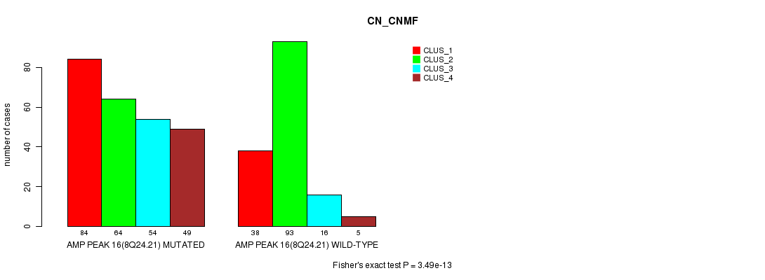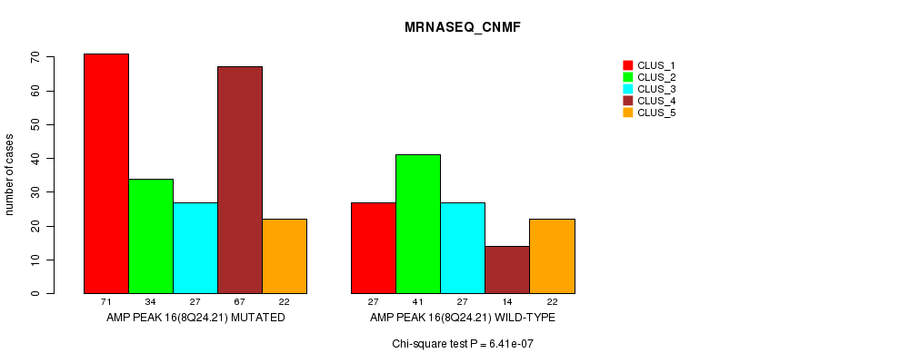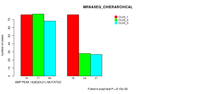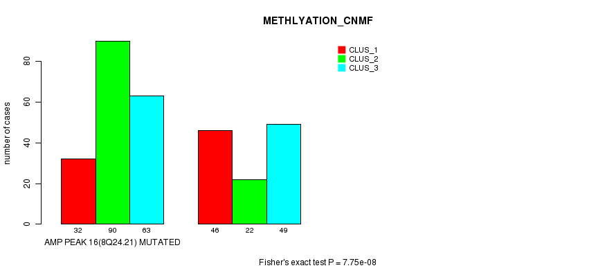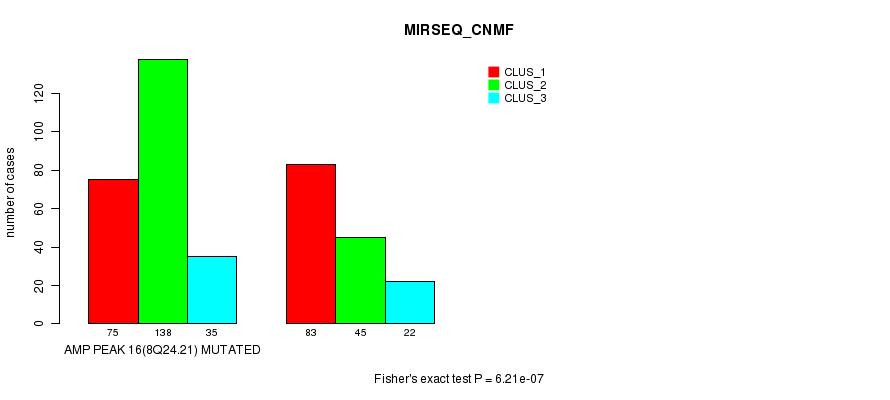 Amp Peak 16(8q24.21) cnvs correlated to 'CN_CNMF', 'METHLYATION_CNMF', 'MRNASEQ_CNMF', 'MRNASEQ_CHIERARCHICAL', 'MIRSEQ_CNMF', and 'MIRSEQ_CHIERARCHICAL'.