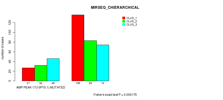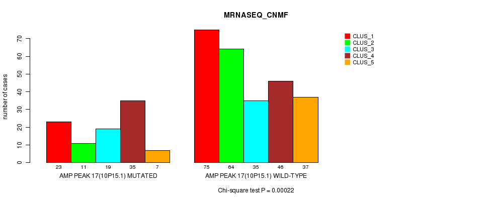 Amp Peak 17(10p15.1) cnvs correlated to 'CN_CNMF', 'METHLYATION_CNMF', 'MRNASEQ_CNMF', 'MRNASEQ_CHIERARCHICAL', and 'MIRSEQ_CHIERARCHICAL'.