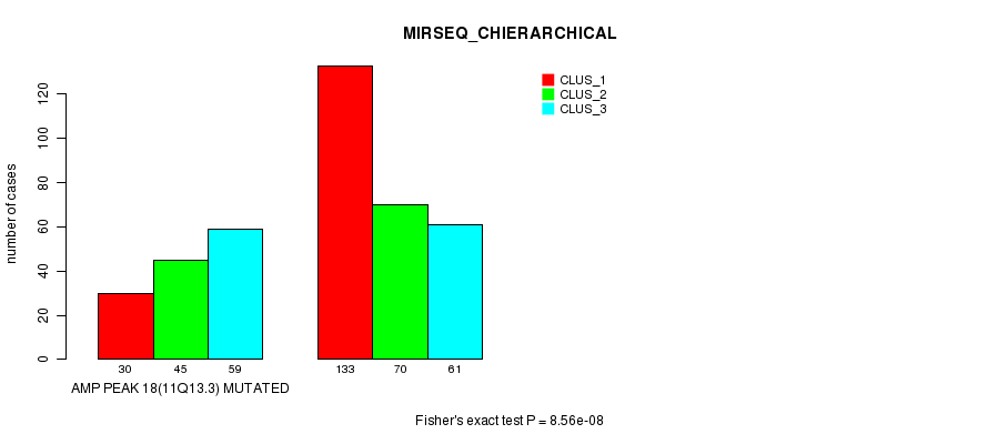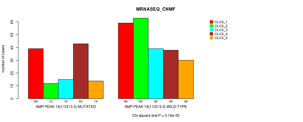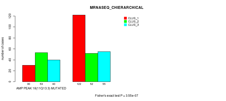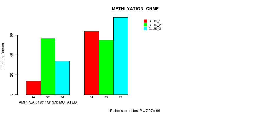 Amp Peak 18(11q13.3) cnvs correlated to 'CN_CNMF', 'METHLYATION_CNMF', 'MRNASEQ_CNMF', 'MRNASEQ_CHIERARCHICAL', 'MIRSEQ_CNMF', and 'MIRSEQ_CHIERARCHICAL'.